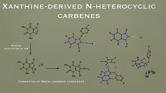 We have developped routes towards carbene ligands derived from natural products (xanthines), which are found in coffee, tea and chocolate and have studied their coordination chemistry with various transition metals.